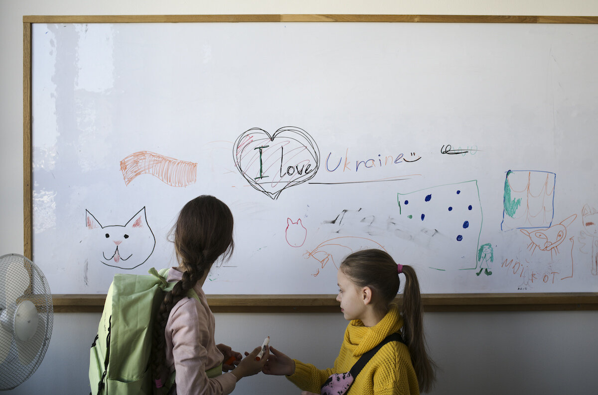 Ukrainian refugee Mariia Kerashchenko tightly clasped the hands of her two children as she walked them through the courtyard of a seedy Berlin building, up a graffiti-covered stairway, and into a modern, sunlit classroom.