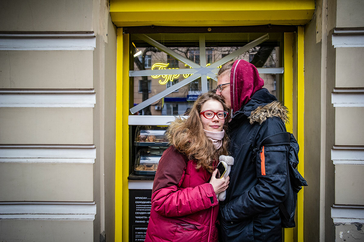 That is the calculation, too, on the other side of town at a coffee shop with a bicycle racing theme, where most customers these days come only to the takeaway window 鈥 which is taped, to minimize potential blast damage 鈥 between air raid sirens. On one recent frigid day, a couple hold each other while waiting for their coffee.