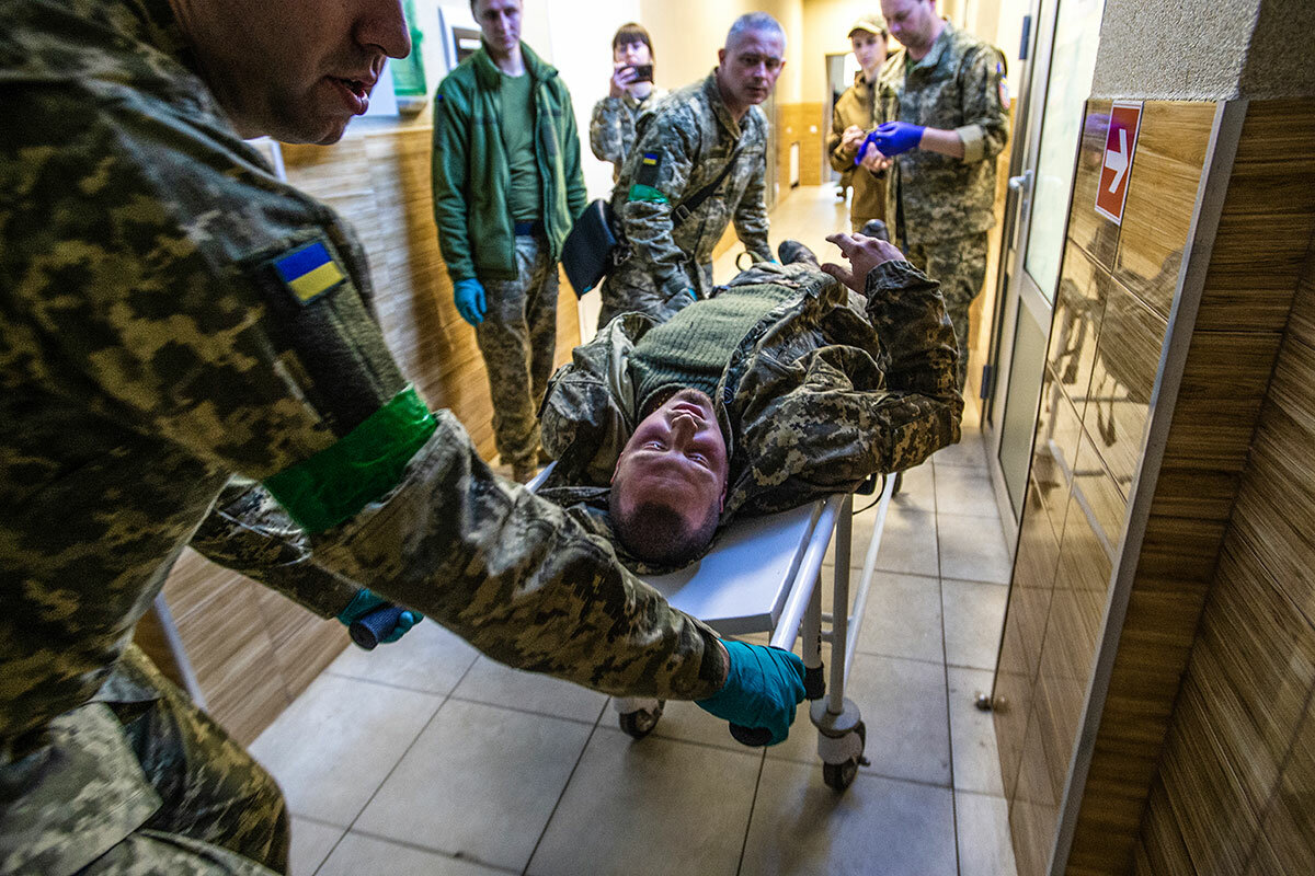 At the Kramatorsk hospital, stretchers line the wall where wounded soldiers are brought from the front, and the facility generator and windows are sandbagged. Major Andriytsiv speaks during a pause in the arrival of casualties, as shells explode in the distance.