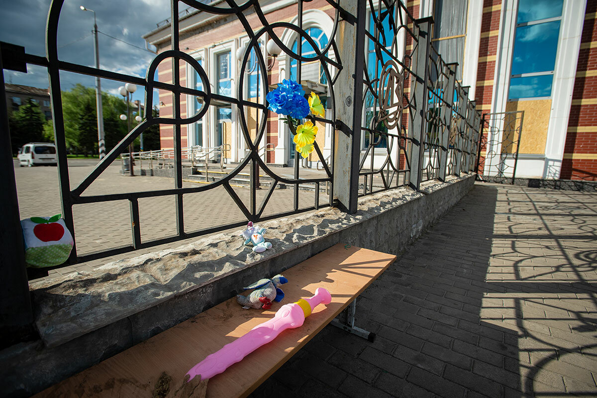 At the station, he points out the blast pattern of one impact on the train platform, near where cloth flowers in the Ukrainian national colors of blue and yellow are tied to a rail, amid several children鈥檚 toys.