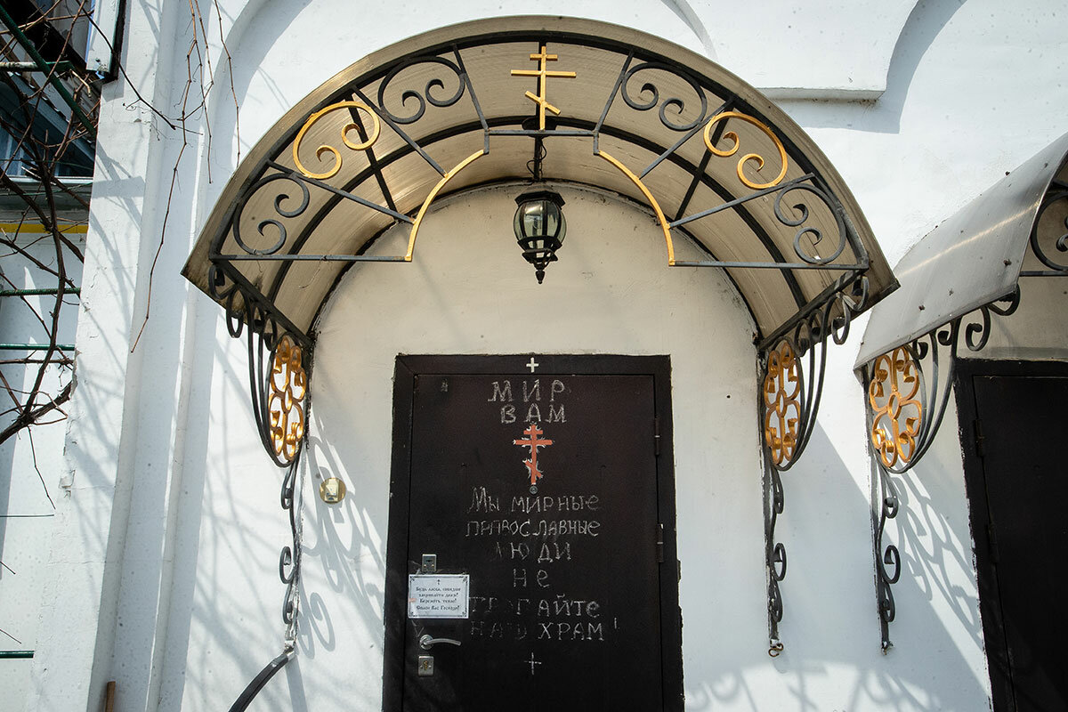 Father Petro says he received threats after Russian forces withdrew. He spray-painted anti-war messages on buildings around his Sviato-Pokrovska church, and on a side door wrote the words 鈥淲e鈥檙e peaceful Orthodox people. Don鈥檛 touch our church.鈥