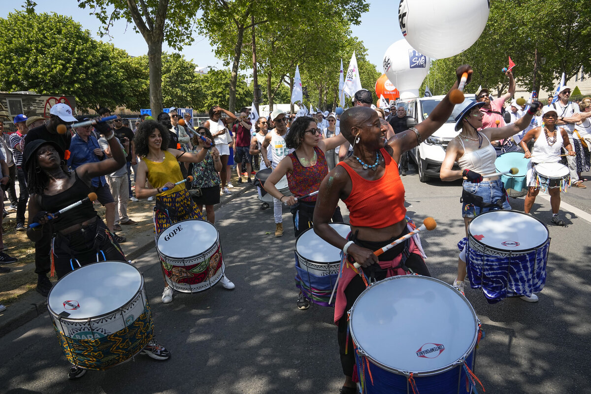 In Paris, thousands gathered along the embankments of the Seine River near the gold-domed Invalides monument before setting off on their march to southeast Paris. The peaceful crowd waved union flags, banged drums, and chanted to demand the withdrawal of the pension law and a lower retirement age.