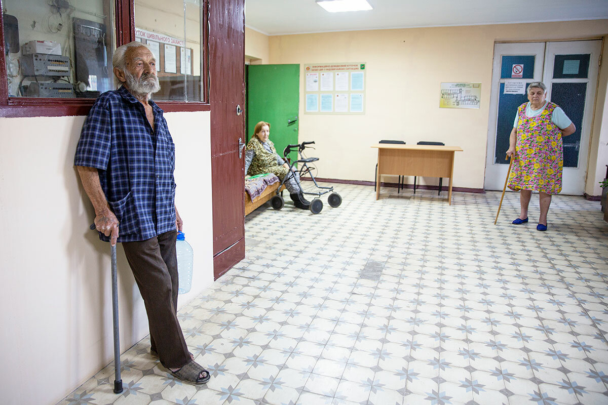 Those in the dormitory are struggling with the aches and pains of old age, amplified by the physical and mental traumas of war. “Stress, stress, stress,” says Valentyna Tkachenko, the day’s de facto administrator after directing people toward bread-distributing volunteers while simultaneously calling paramedics to help a man who appears to be in distress. It’s like running a hospice or a mental institution, she says, minus the qualified staff.