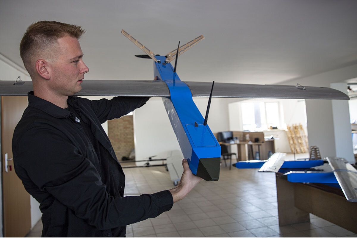 Prototypes of attack and surveillance drones built by his company, Besomar (White Demon), fill a spacious room in a bare-bones office building in Lviv.
