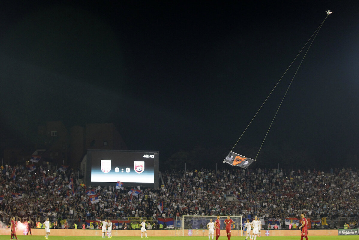 A drone carrying an Albanian nationalist flag caused chaos when it flew above the stadium and down to field level as Serbia hosted Albania for a Euro 2016 qualifying game in October 2014.