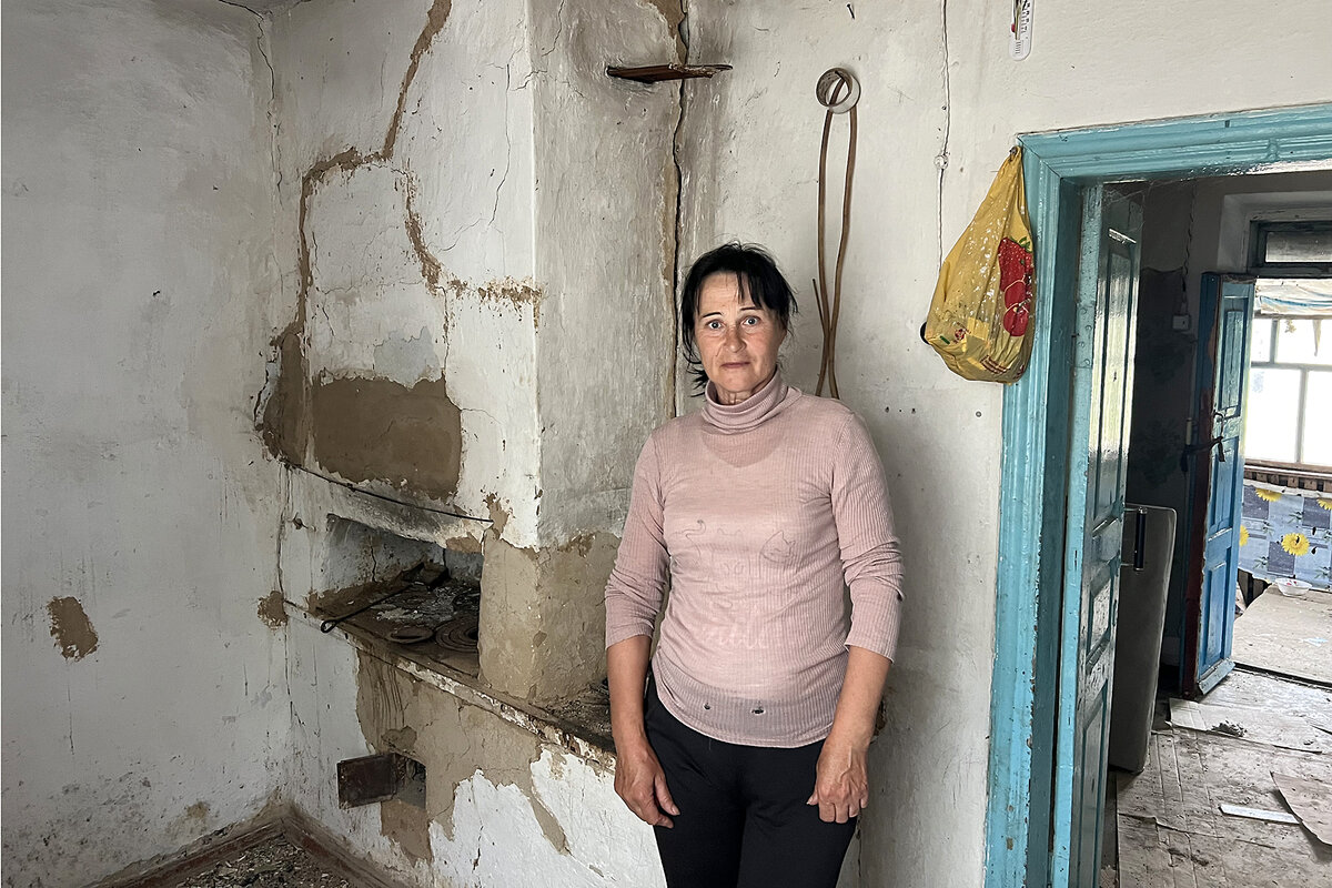 Across the Inhulets River, in the village of Zapovit, Svitlana Zyma opens the door to her house, which floodwaters left uninhabitable.