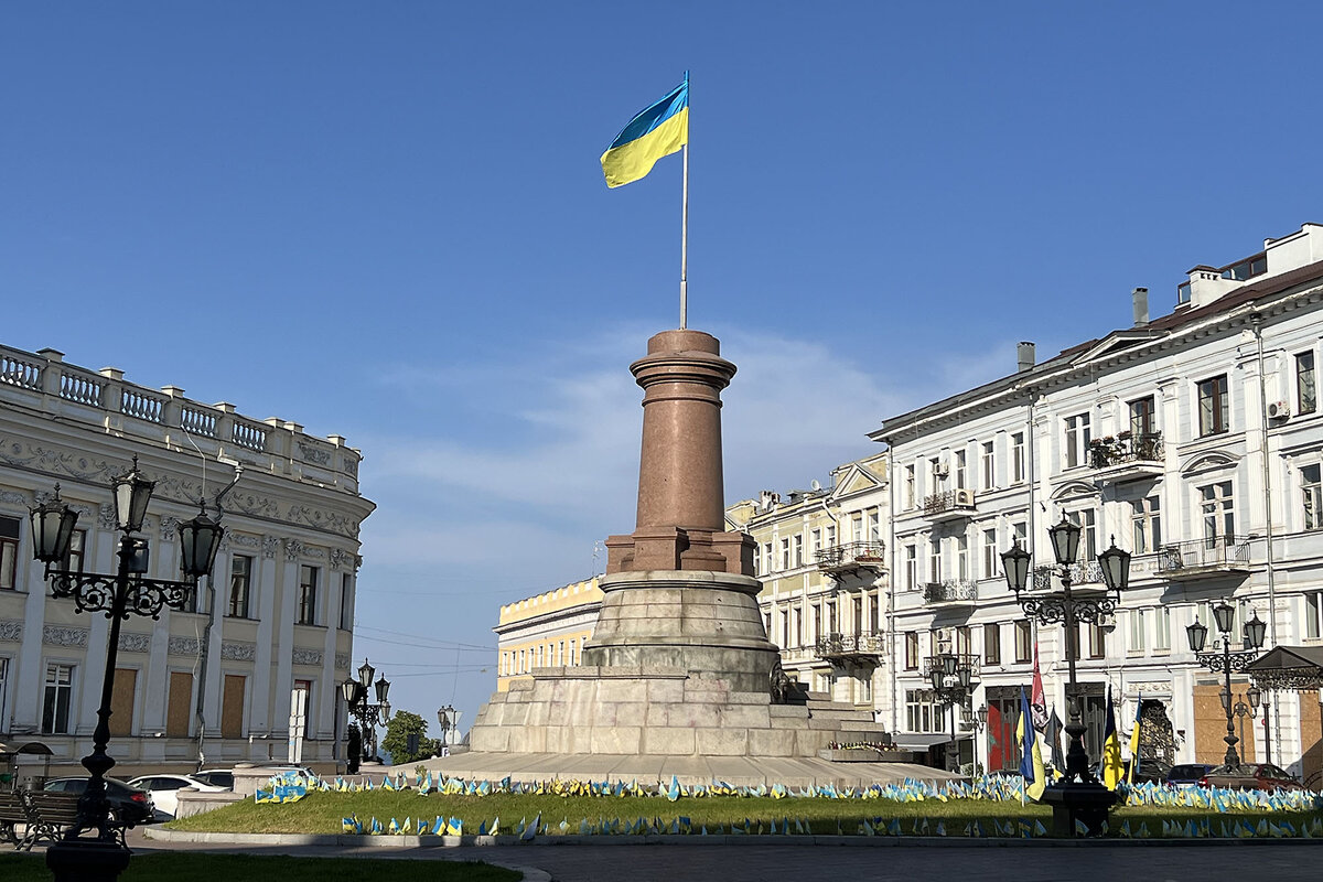 Indeed, in Odesa鈥檚 central historic district, the marble pedestal that once supported a statue of Catherine II of Russia 鈥 long considered the founder of Odesa 鈥 now holds the sky-blue and sunflower-yellow Ukrainian flag. These days the monument is ringed by dozens of small Ukrainian flags placed in memory of fallen soldiers.