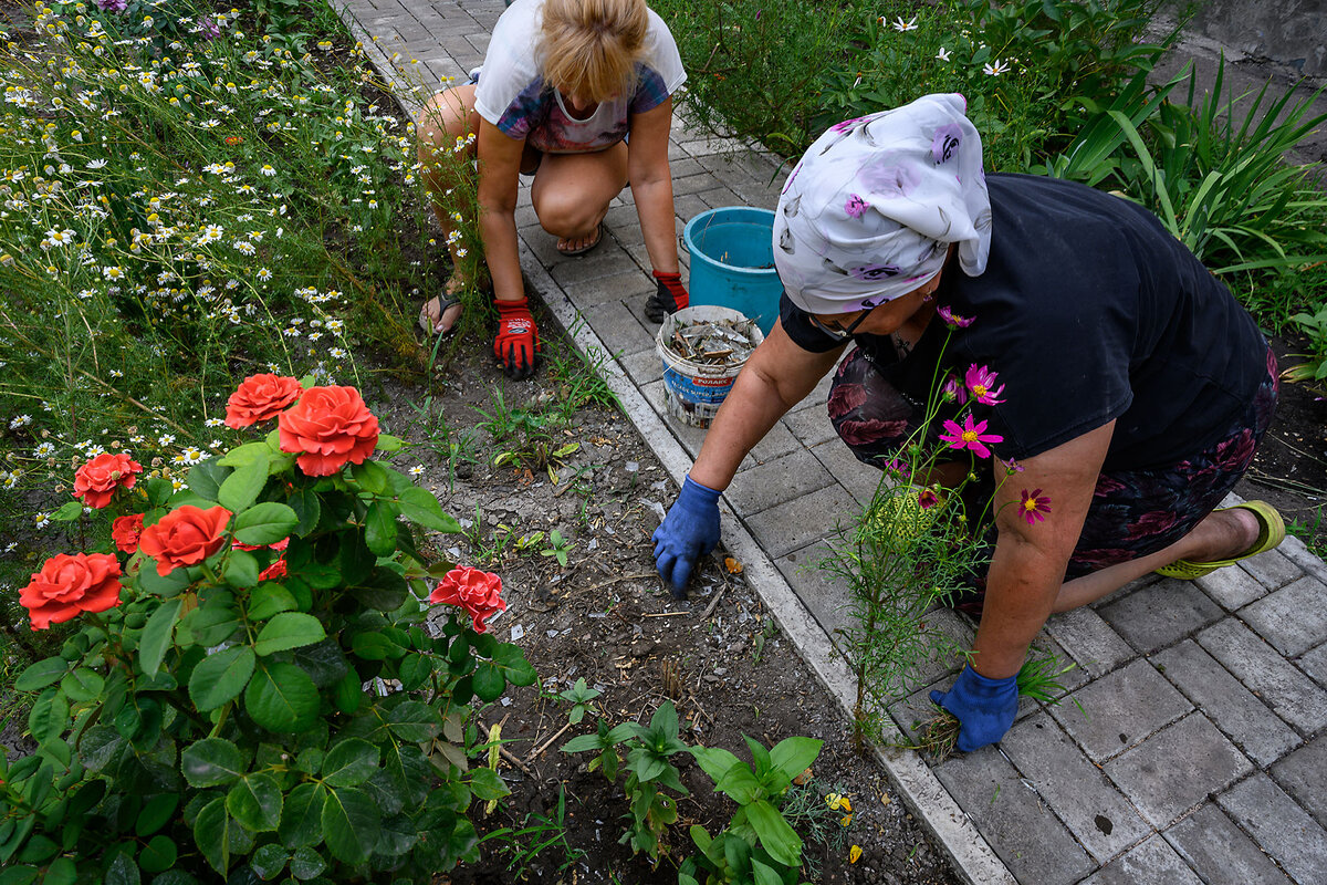 Days after one barrage, the residents of a decades-old building in Myrnohrad are still carefully collecting shards of glass from their rose garden. All the windows blew out when two Russian missiles struck an adjacent school and two more hit a bus stop, killing four coal mine workers.