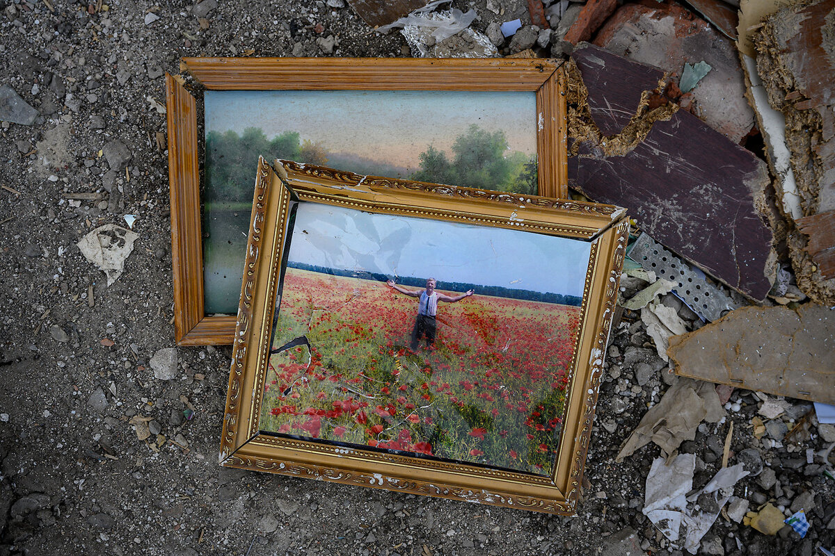 He steps into an abandoned Soviet-era theater, where the engine of one Russian rocket still hangs from the ceiling where it fell, two weeks earlier. Ironically, on a wall nearby remains a tile mosaic that commemorates Moscow’s former friendship with the Ukrainian Soviet Socialist Republic.