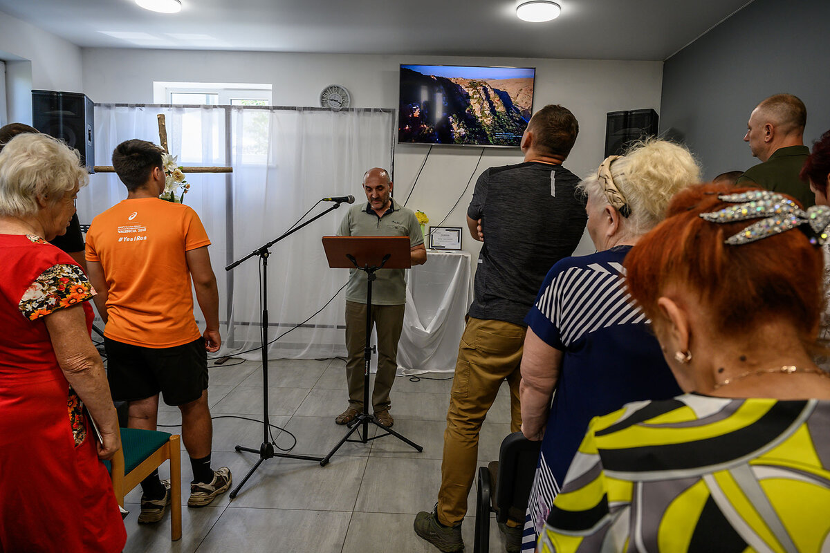 Among those heeding his call is Valentyna Mertsalova, a 70-something pensioner with white hair and a red dress, who the next day sat emotionally during a service at the pastor’s church. A handful of uniformed military soldiers in the 80-plus congregation were called forward and thanked for their service.