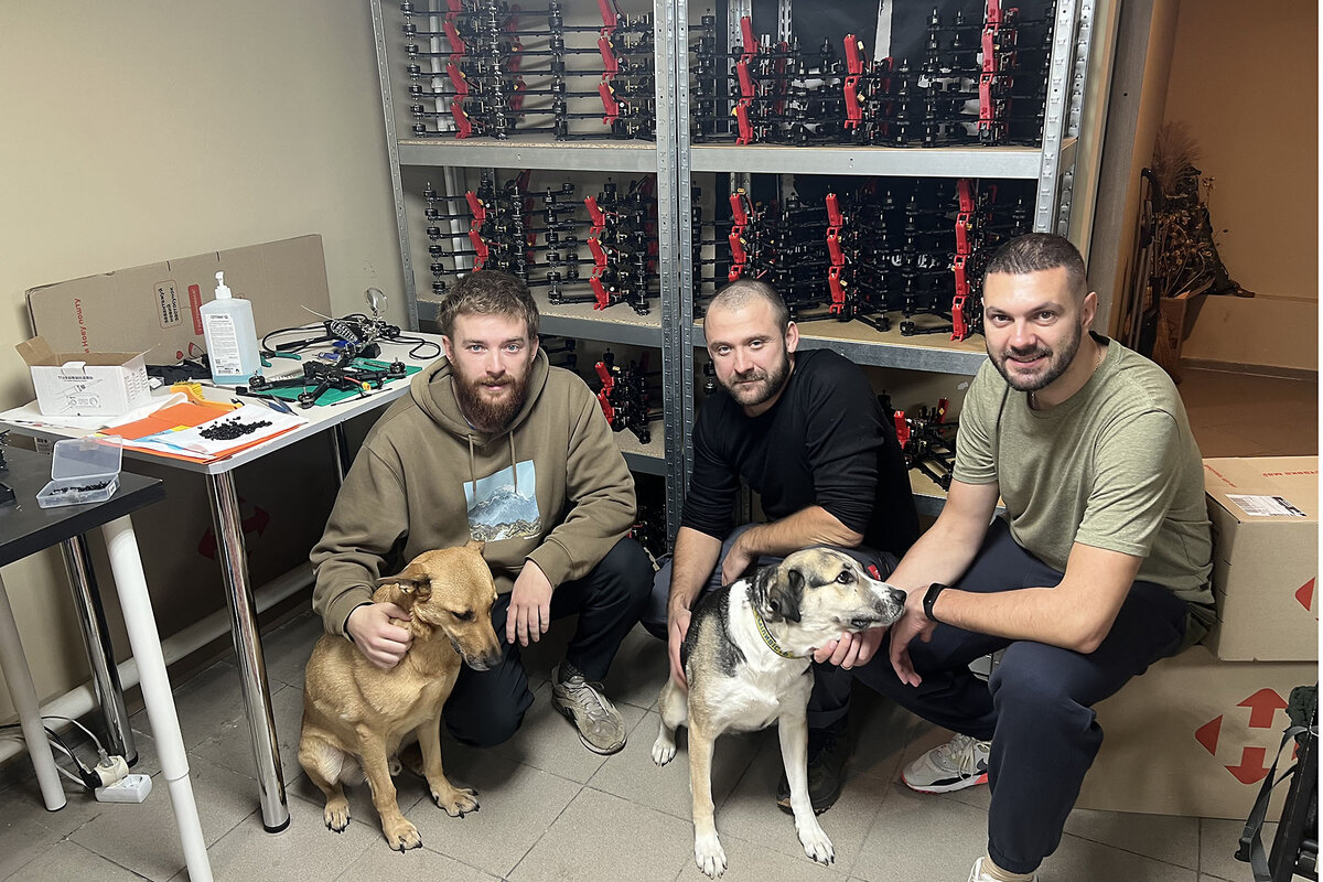Back at Klyn Drones, in a space the size of a small classroom, Mr. Yukhno and fellow assemblers Sasha and Stanislav do the painstaking work of drone-building. They wield small screw drivers, tweezers, and solder guns, with dogs Lilou and Leonia 鈥 both strays picked up in abandoned villages 鈥 at their feet.