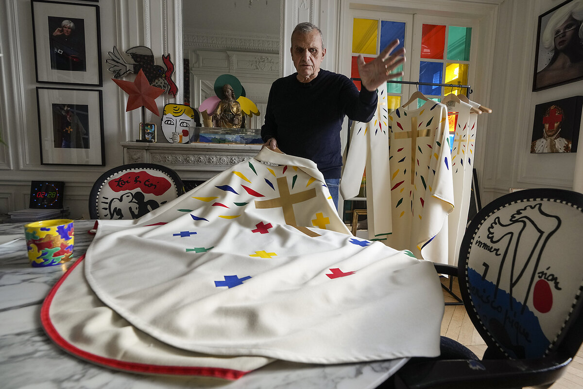 Fashion designer Jean-Charles de Castelbajac, who has dressed Madonna, Lady Gaga, and Pope John Paul II, says he was given free rein to design the liturgical garments for Notre Dame. The robes he came up with, made of off-white Scottish wool gabardine, feature sprays of red, blue, and yellow fragments surrounding a gold cross.