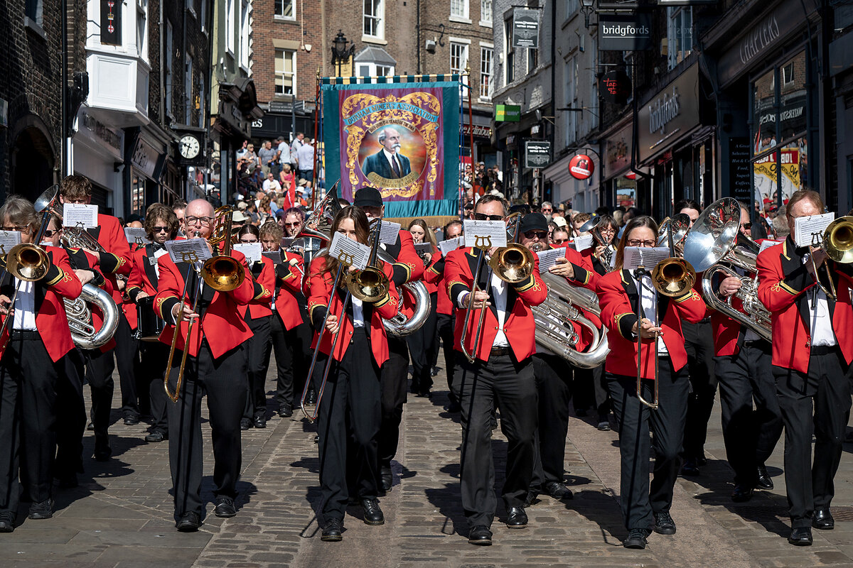 The village pub opened early for breakfast, and as the brass band switches to playing upbeat pop songs and the mist starts to lift, the townsfolk, young and old, cheer the passing banners.