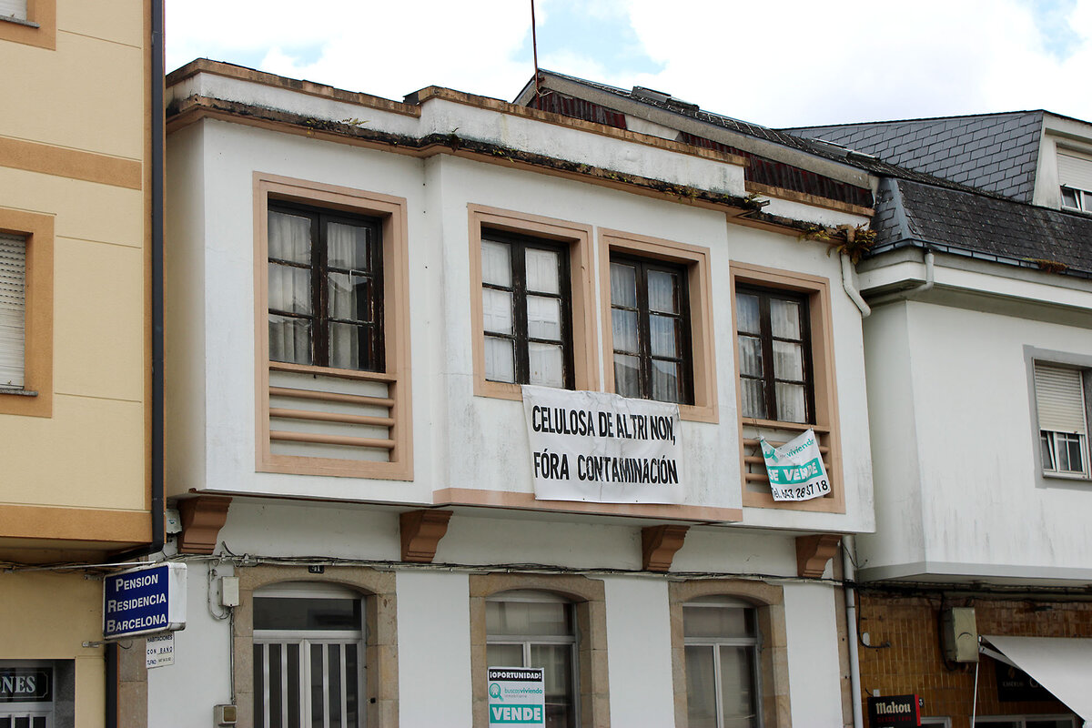 In Palas de Rei, the proposed site for the factory, pilgrims traveling the Camino de Santiago pass balconies draped with banners: 鈥淣o to the Altri pulp mill, out with contamination.鈥