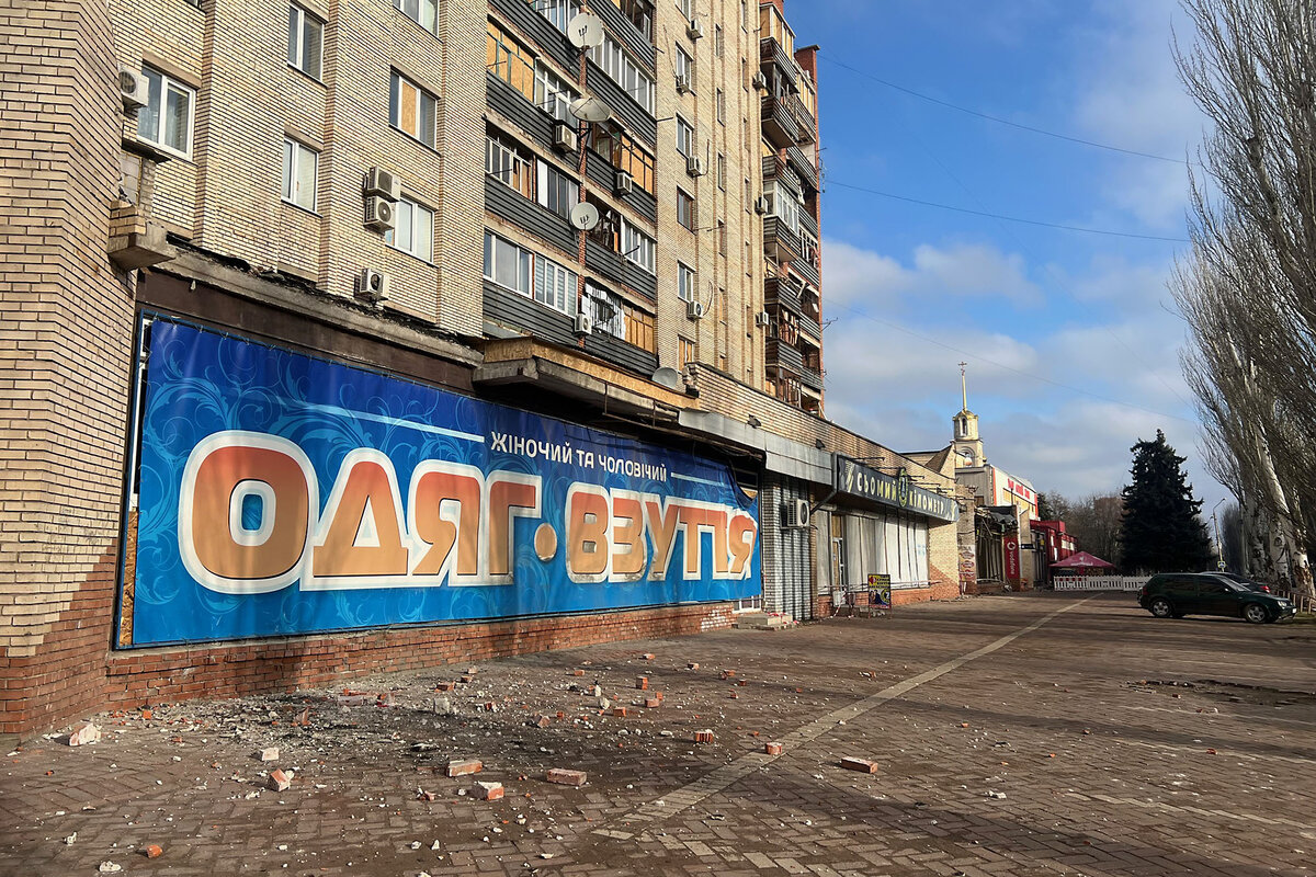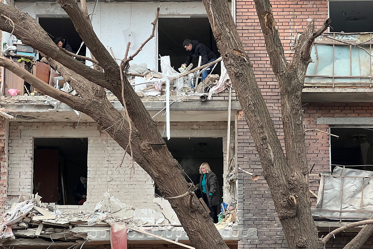 As repair work got underway the next morning, emergency workers in lime-green vests tossed chunks of plaster, insulation, and mangled appliances from exposed upper floors. Volunteers with the Angels of Salvation humanitarian organization cut plywood to cover blasted windows against the cold.