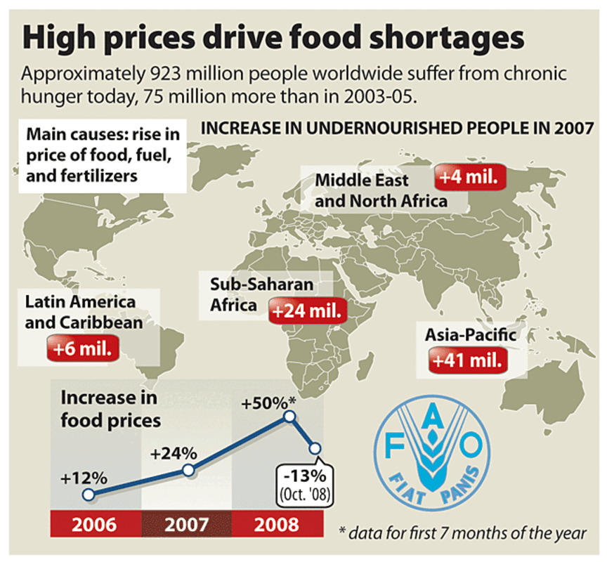 The problem is playing out across the globe: food prices rose by 24 percent in 2007, pushing 75 million more people into chronic hunger, estimates the United Nations' Food and Agricultural Organization (FAO). In 2008, food prices surged again by 51 percent, meaning that millions more are likely to join the 923 million people already suffering from malnutrition. World food prices have come down by a modest 6 percent since September, the FAO estimates, but that can't reverse the damage already wreaking its way across the globe.