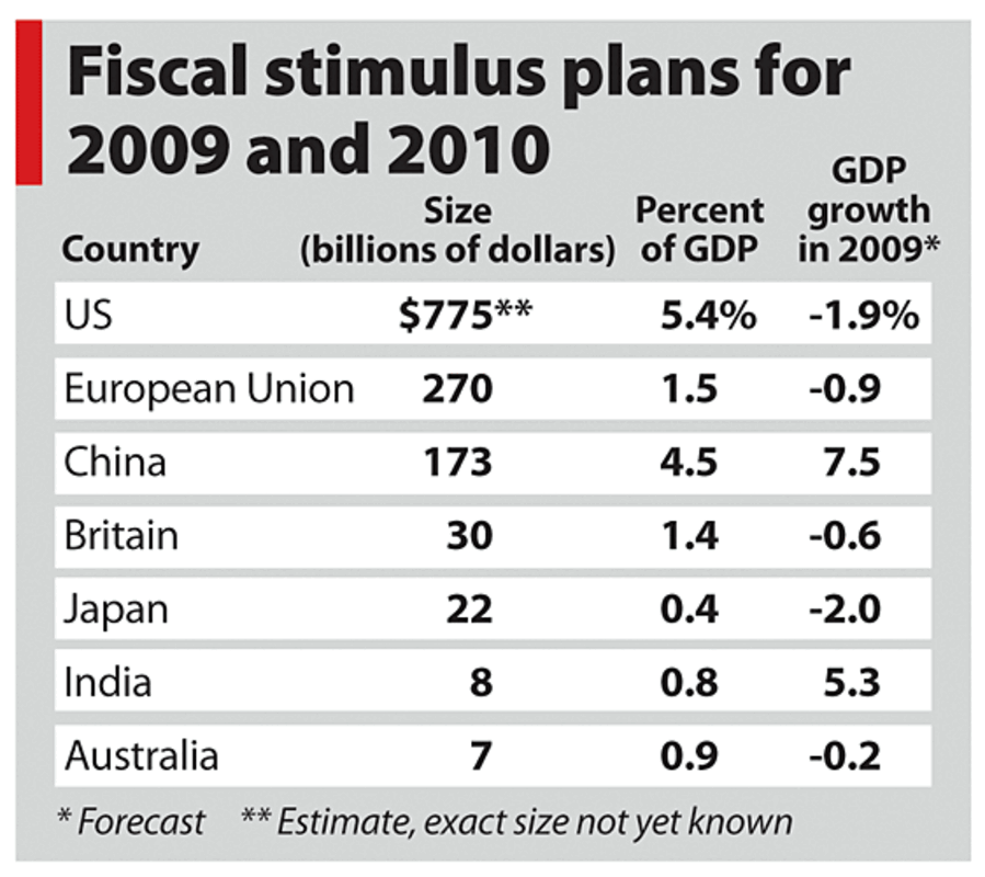 America is at the epicenter of the downturn, which helps explain why President-elect Obama and his team are readying a spending package that may be equal to about 2.5 percent of US gross domestic product in 2009, as well as a similar amount in 2010.