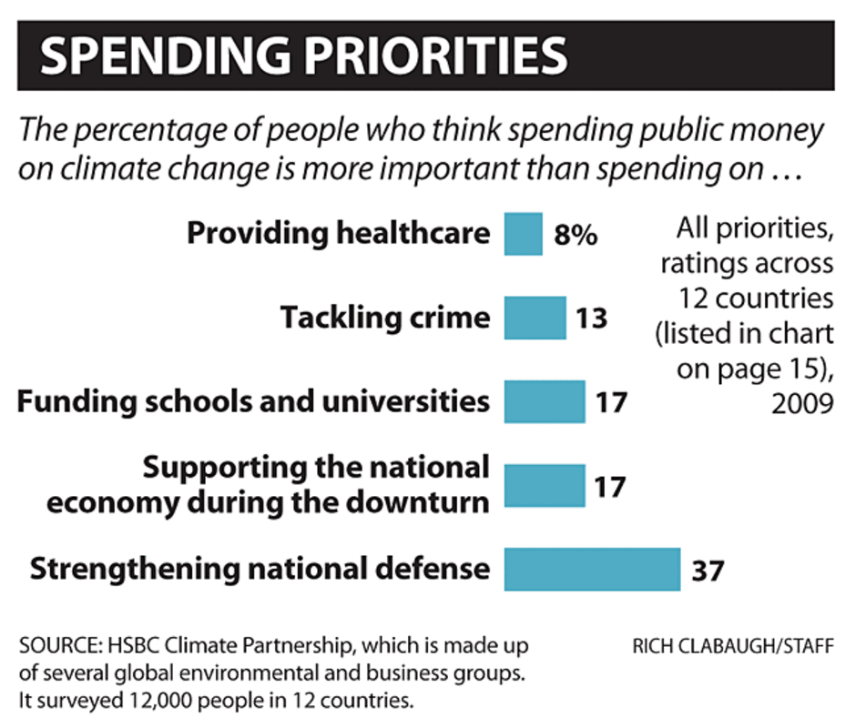 And to be sure, other barometers show that concern about the issue remains strong. In a recent poll taken in 12 countries that represent just over half of the world's population, 65 percent of people say it's very important that a deal be reached at Copenhagen. Fully 79 percent of the respondents to the survey, sponsored by the HSBC Climate Partnership, made up of several global environmental and business groups, want some kind of emissions-reduction targets put in place.