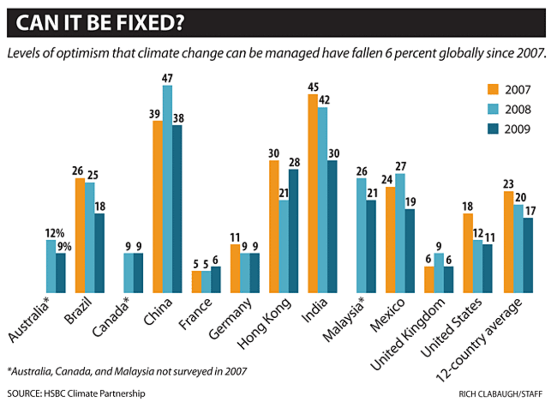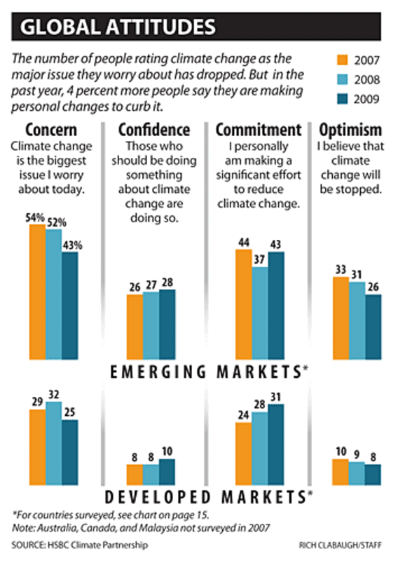 Welcome to public attitudes in this year of Mother Earth, circa late 2009. As the US and other nations prepare for a global summit on climate change in Copenhagen, Denmark, Dec. 7-18, the biggest problem facing delegates may not be all the political differences between rich nations and poor, between developed countries and developing ones, between big smokestack nations and lesser ones.