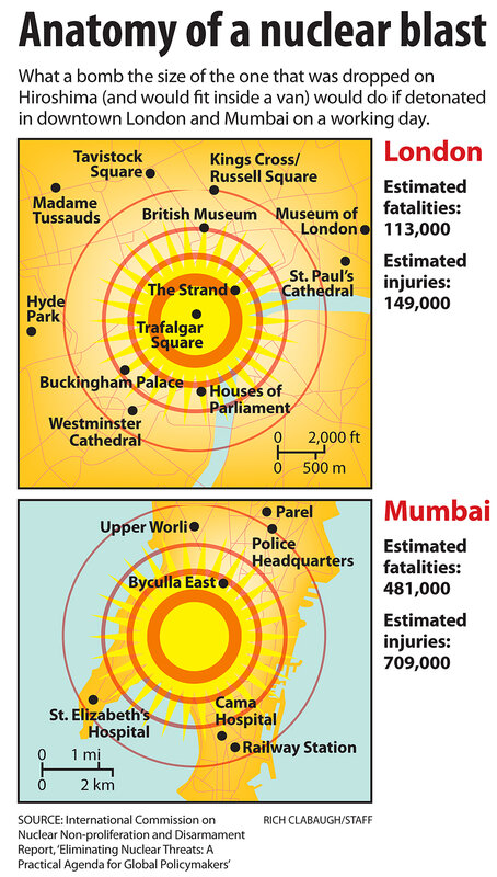 The study, by former Foreign Ministers Gareth Evans and Yoriko Kawaguchi (of Australia and Japan, respectively), says that a weapon detonated from inside the back of a large van in London's Trafalgar Square in the middle of a workday would cause an estimated 115,000 fatalities and another 149,000 injuries from a combination of blast, fire, and radiation poisoning; detonated in population-dense central Mumbai, the figures would be more like 481,000 fatalities and 709,000 injuries.