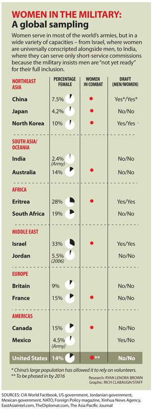 The US joins a number of countries, from Canada to Australia, that are pushing against old notions that women have neither the stamina nor strength to serve on front lines, that they should be home mothering children, or that militaries are better off without sexual tension in the barracks. That could have implications for armies around the world, from countries in Europe to Latin America to Africa, where women are still confined to gender-specific tasks.