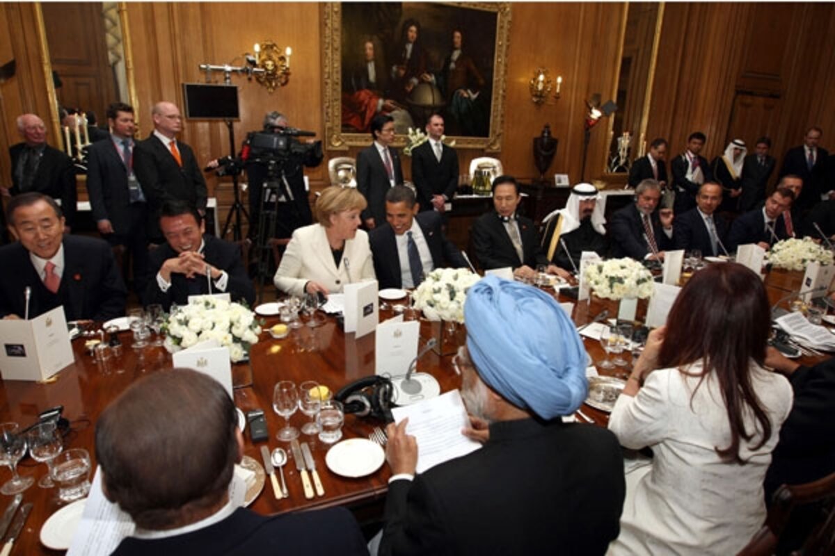 Merkel was seated right beside the US president, offering an important opportunity for the two to reach greater d茅tente. Directly across from them, Gordon Brown had Hu on his right, with Sarkozy just one seat beyond China鈥檚 president.