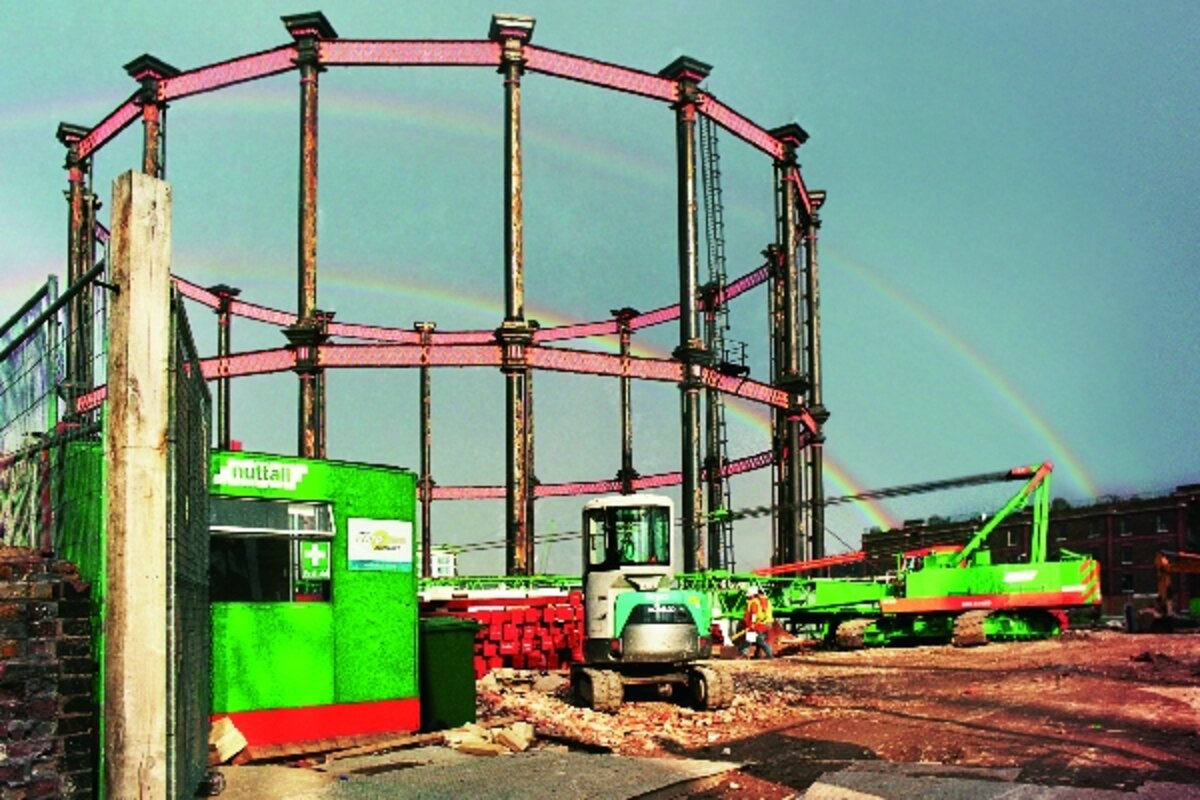 The project involves both new construction and renovation of existing architecture with “historic interest.” Among these landmarks are some remarkable Victorian gasholders. The enormous tanks no longer hold fuel. Yet to historic preservationists it is out of the question for all of them – nine at one time – to simply be demolished. Their decorative iron “guide frames” (columns and circles making intricate patterns against the sky) have a beauty that is something more than a fine example of Victorian industry.