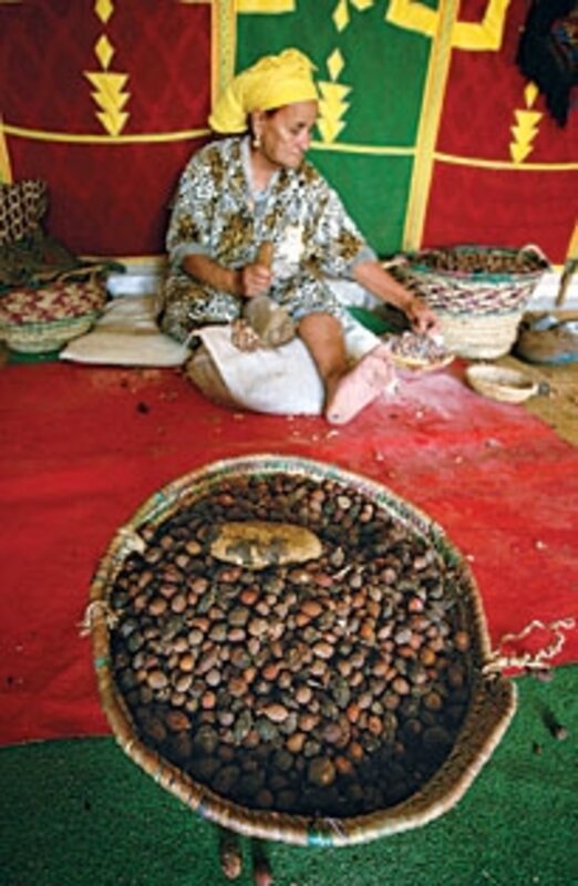 Argan oil comes from the two to three kernels found inside the pit of the oval-shaped green fruit of the tree. Traditionally, it is women who crack the pit, lightly roast the kernels, then pound and knead the resulting paste to extract the oil.