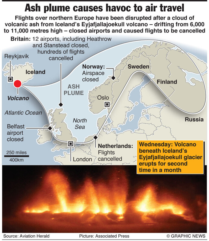 Ash from Iceland volcano shuts all British airports and affects air travel across northern Europe