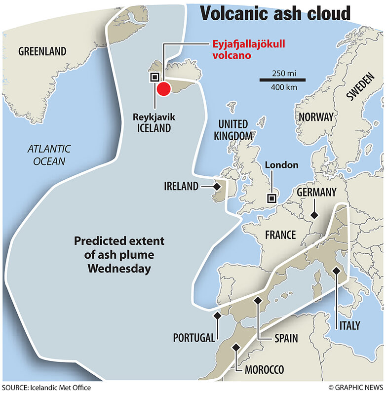 Eurocontrol is tracking multiple ash clouds from the Icelandic volcano, defined by the altitude they inhabit. An ash cloud聽is roughly the same size as Europe. The cloud covers the southern half of Iceland and stretches thousands of miles south over the Atlantic Ocean. At the southern end of the cloud, a thin arm extends east over the Strait of Gibraltar and into Spain.