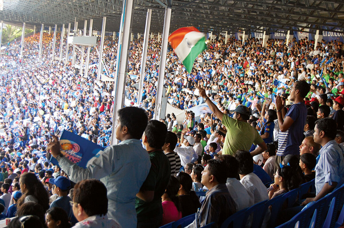 The beat of 鈥淲e Will Rock You鈥 shakes the South Bombay stadium as fans in devil horns and curly blue wigs hoot party horns for belly-baring blond cheerleaders on a platform flanked by flaming torches. Red, white, and green fireworks streak the 5 p.m. sky as a sportscaster draws out the chant: 鈥MUMBAI... INDIANS!鈥