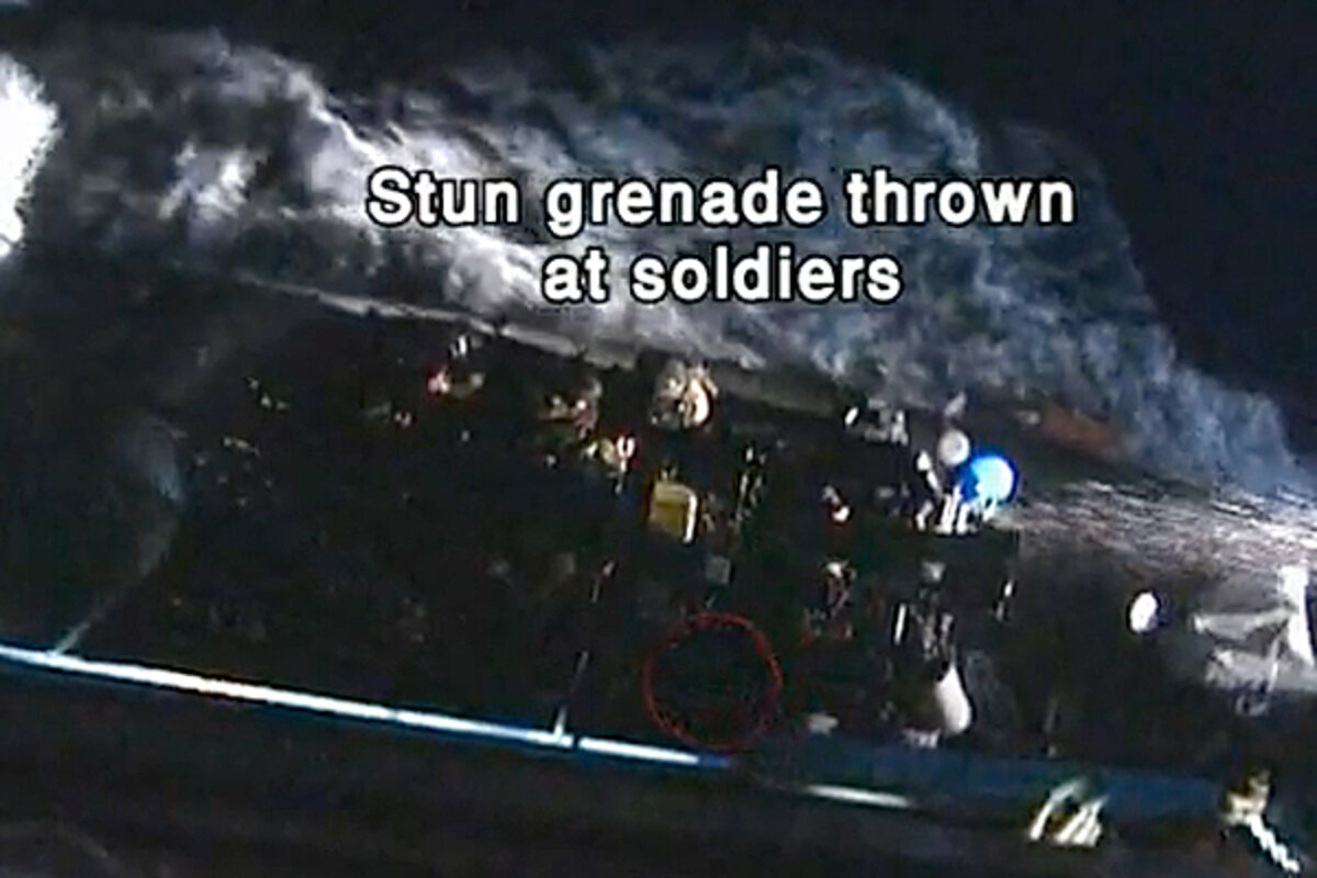 The video, which was filmed from aboard the Mavi Marmara, shows activists aboard the ship tossing a stun grenade at the Israeli boat and using chains and metal bars to prevent the Israeli soldiers from climbing aboard.