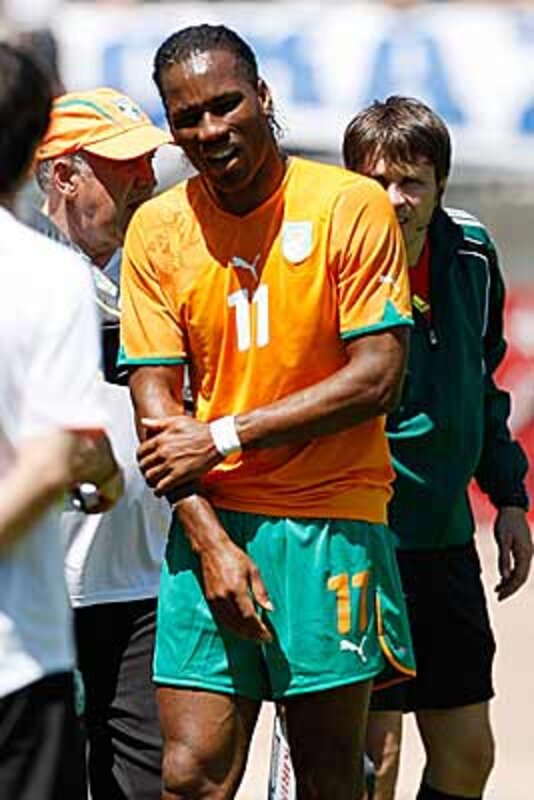 IVORY COAST: Didier Drogba broke his forearm Friday and underwent surgery Saturday. He is one of the world's top strikers and highest paid players (as a member of English Premier League champions, Chelsea). Mr. Drogba in time for the June 15 opener against Portugal.