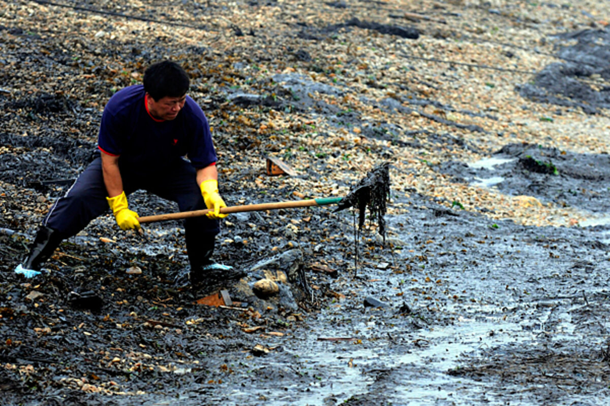 China mobilized hundreds of local fishing boats and vessels to aid in the cleanup, but workers were woefully unprepared, initially using plastic bags, straw mats, and even chopsticks to remove oil from the water, according to news reports.