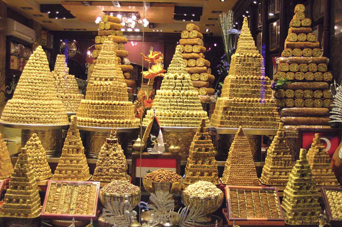 Trays of date, dried apricot, pistachio, and cream-filled morsels never fail to delight. In Midan, with its street of popular restaurants, sweet-shop owners try to outdo competitors by creating displays of unusually shaped stacks of sugary treats.
