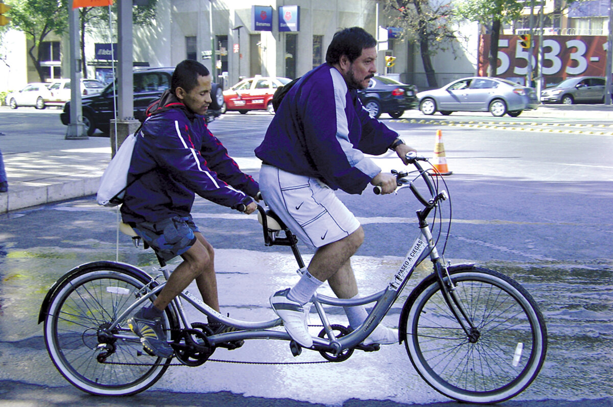 Every Sunday, a dozen volunteers are stationed along Reforma Avenue, when the main boulevard closes to promote cycling, offering tandem rides for the blind with sighted riders.