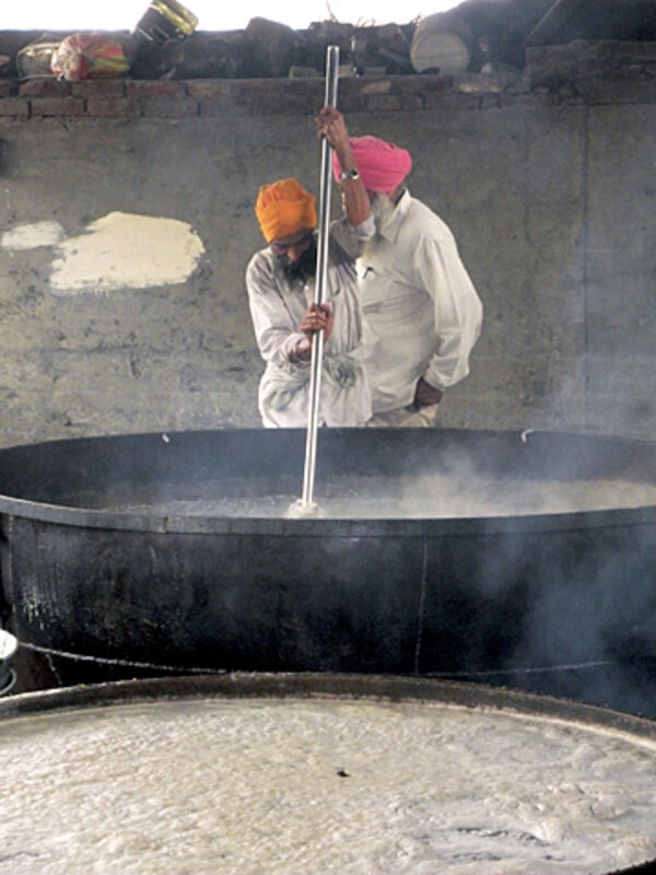 The two-story langar (free kitchen) offers fresh vegetarian meals daily to tens of thousands through the efforts of devoted volunteers, who serve lentils from deep pots, wash tin plates, pass out water and chai, and stir caldrons of rice pudding over wooden fires. Everything is made from scratch, even flour and chili powder is ground on site. Ingredients are stored in the basement, including ghee (clarified butter) and donated wheat.