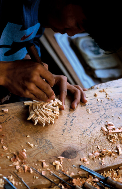 Inside a quiet workshop, chisels are lined up on desks littered with shavings. The room is thick with the smell of fresh wood. Thunstok Nimgoliy peers at his square carving before switching tools.