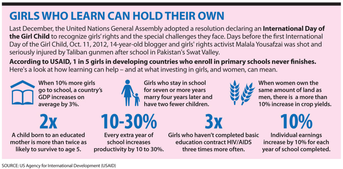 Efforts by girls to stay in school meet resistance from parents in poverty, ingrained cultural traditions, and, as we were reminded in Pakistan this week, radical Islamists. A Pakistani Taliban gunman shot twice 14-year-old Malala Yousafzai after she spoke out against the group and its efforts to shut down girls' schooling in Swat. She is recovering in a military hospital.听