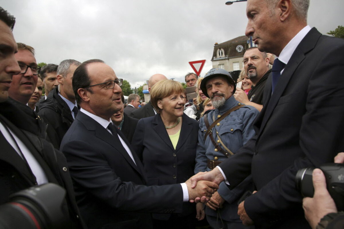 Hollande and Merkel spent the entire day together. In the morning, he welcomed his German counterpart under heavy rain at the German cemetery of Consenvoye, near Verdun, where 11,148 German soldiers are buried. They laid a wreath, accompanied by four German and French children, and walked side by side for few minutes in the cemetery, sharing an umbrella.