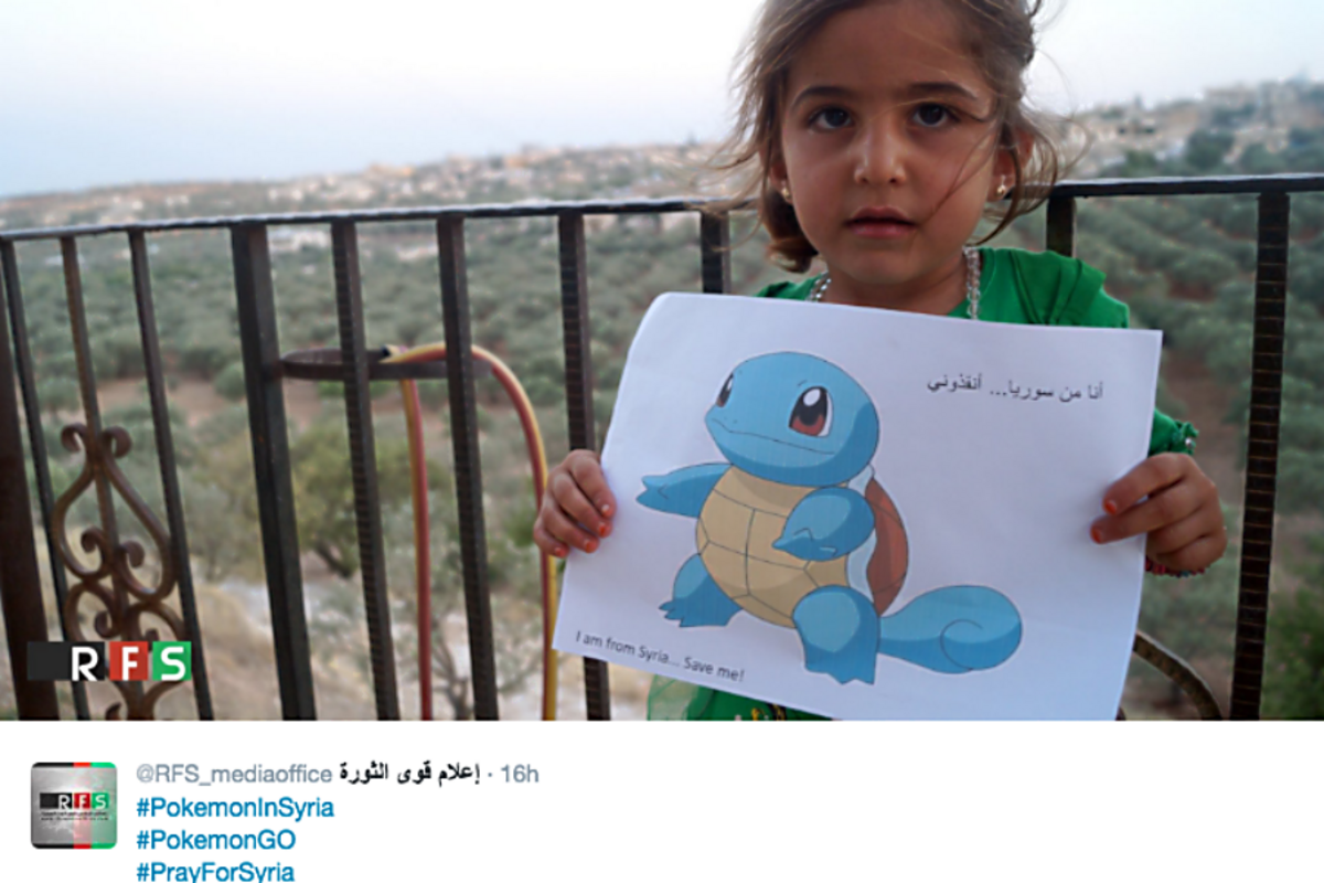 The Revolutionary Forces of Syria Media Office, an organization of pro-opposition journalist-activists, has been using the craze, and its Twitter hashtag, #PokemonGo, to raise awareness about the continued plight of children living in the . Syria is home to who are currently living in poverty, displacement, or near violence within its borders. A million of those children are outside areas where aid workers regularly reach.