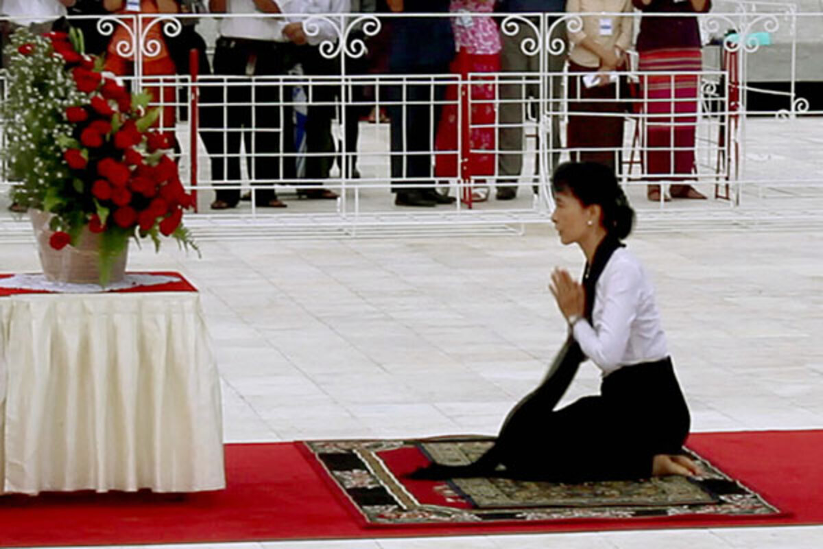Suu Kyi earlier attended the government's ceremony at the mausoleum for Martyrs' Day, which marks the anniversary of the 1947 assassination of Gen. Aung San and colleagues during a Cabinet meeting shortly after Britain agreed to grant independence to what was then known as Burma.