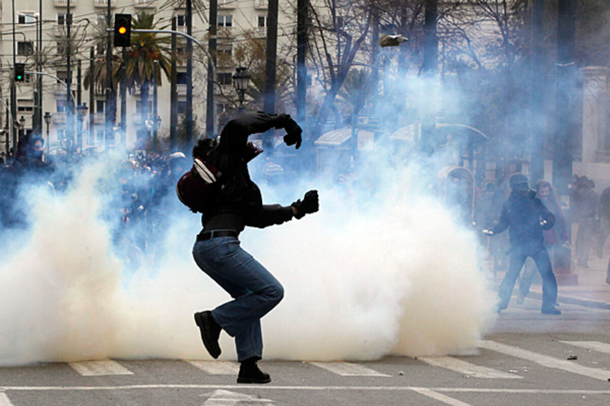 Police fired teargas as black-masked protesters threw petrol bombs, stones and bottles in central聽Athens. The biggest police trade union said it would issue arrest warrants for聽Greece's international lenders for subverting democracy, and refused to "fight against our brothers".