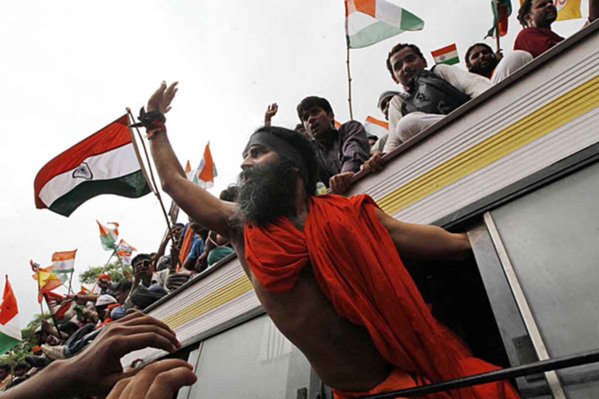 Before the march, the bearded, saffron-clad yogi urged his supporters to throw out the ruling Congress Party and bring in a "clean" government.