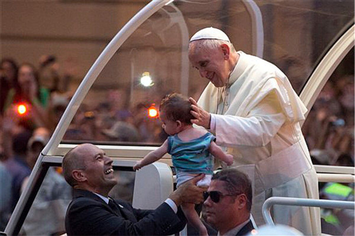 The three dozen visible Vatican and Brazilian plainclothes security officials struggled to keep the crowds at bay. Francis, however, not only looked calm but got even closer to the people. He rolled down his back-seat window, waved to the crowd and touched those who reached inside. He kissed a baby a woman handed to him.