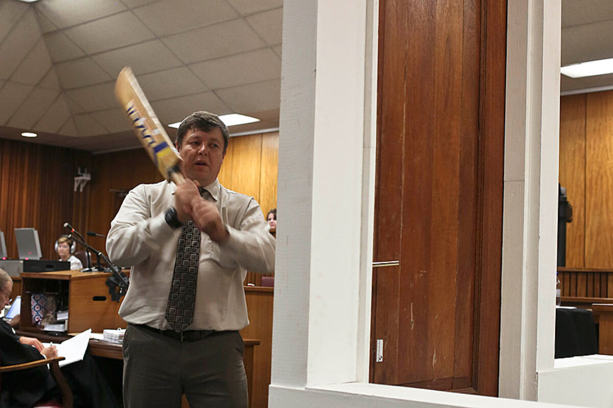 However, Vermeulen said the bat was used to hit the door from a low position, and he knelt and swung Pistorius' cricket bat at the door to demonstrate his point.