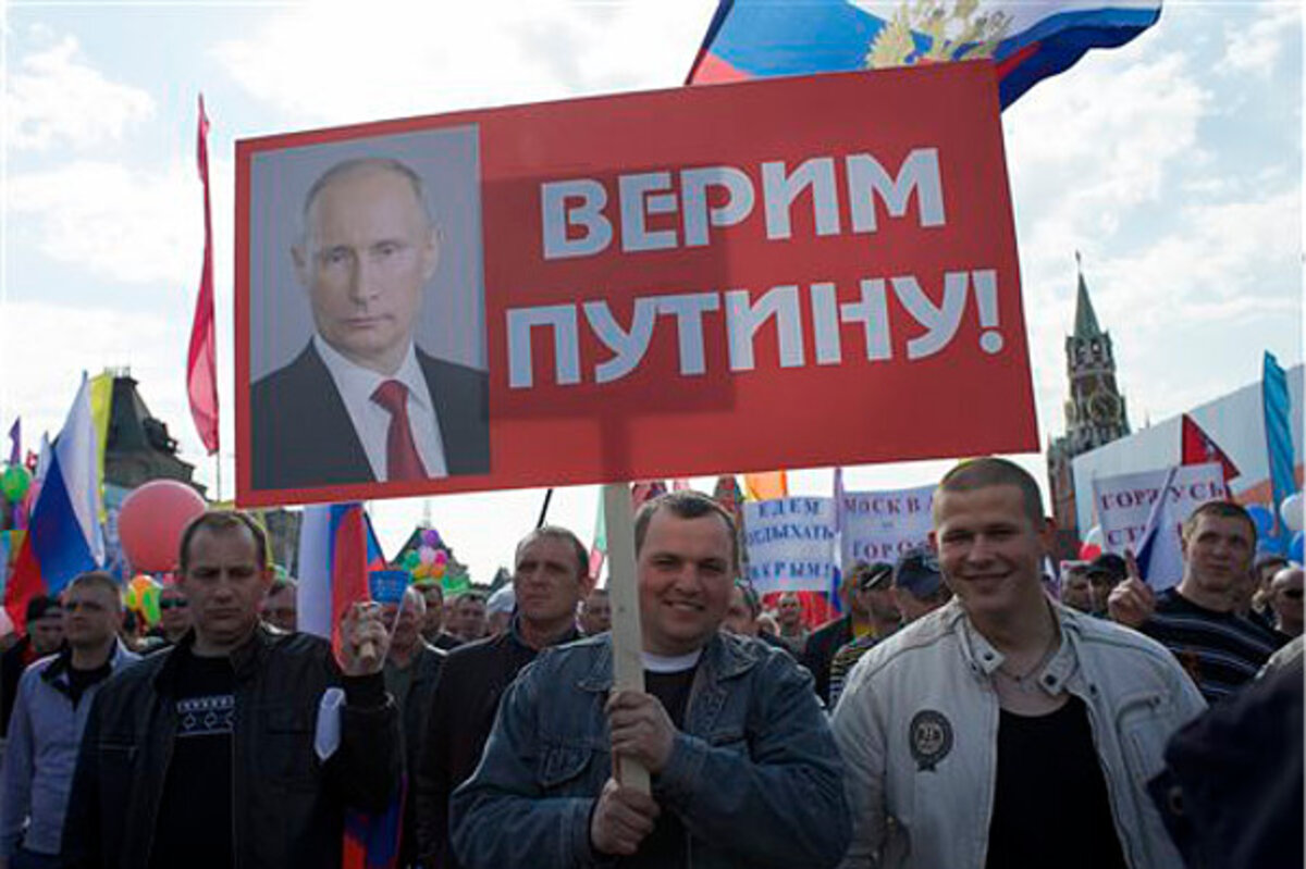 The Moscow parade of about 100,000 people was organized by trade unions and ostensibly dedicated to honoring the working class. The overarching theme, however, was Russian pride over last month's annexation of Crimea. Putin, who did not attend, was saluted as a national hero.