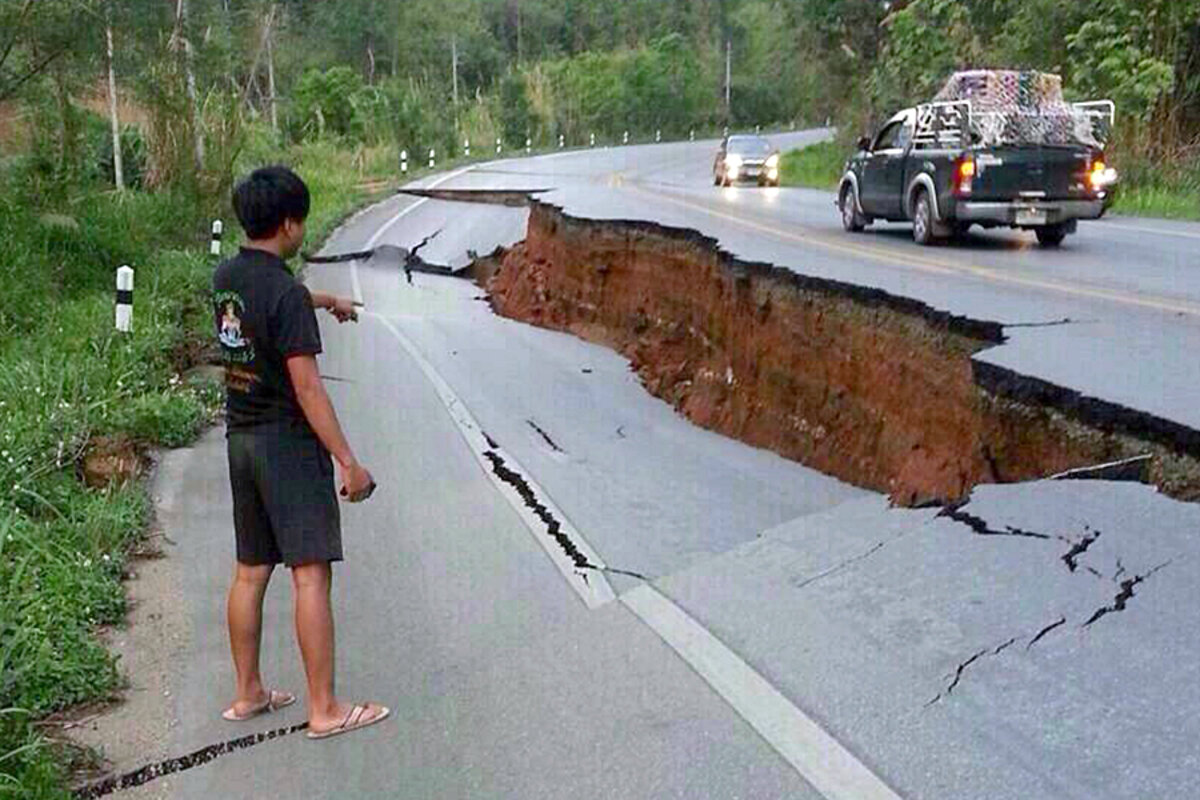 In Chiang Rai's Phan district, a road was split by multiple cracks, the worst a waist-high gash about the length of three vehicles.