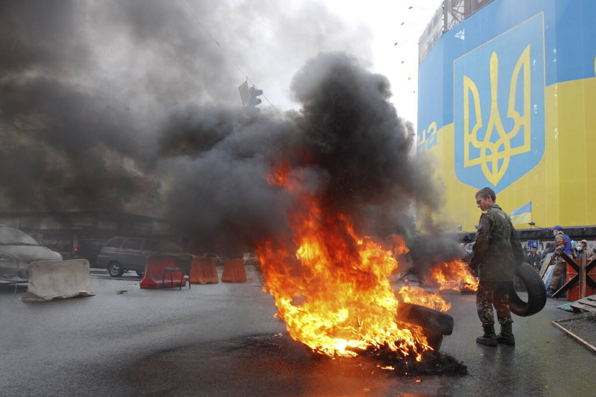 Demonstrators on the main downtown avenue of Ukraine's capital set piles of tires ablaze on Saturday to protest authorities' call to end the encampment that began six months ago. A few hundred meters away, workers in hard hats cleared debris from torn-down barricades.