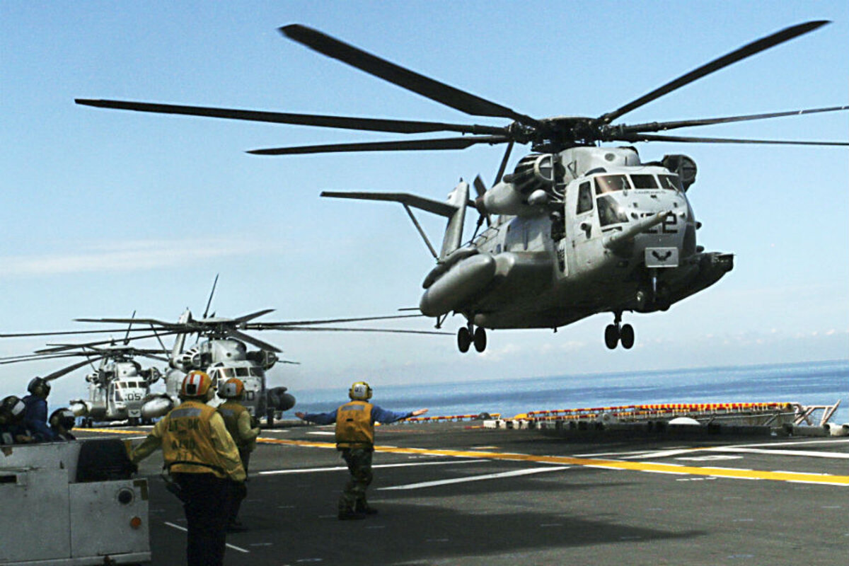 The CH-53E Super Stallion helicopter crashed Monday as it attempted to land on the ship, which has a big landing deck on the back. The Navy said the crash was not the result of hostile activity, but the aircraft was transferring troops back to the ship from training in nearby Djibouti.